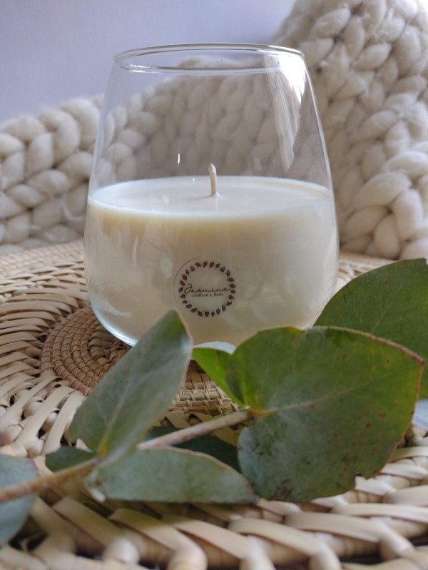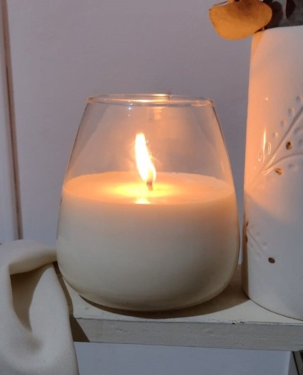 Vela de cera de soja 100% natural, biodegradable, amigable con el medio ambiente y con envase reciclable.