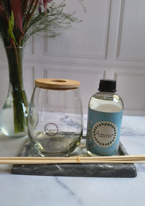 Viene con 1 juego de varillas de ratán que permiten una mejor absorción del aroma por su textura porosa y con un envase de 250 ml del aroma que más les guste, para que puedan vertido dentro del envase bombé.